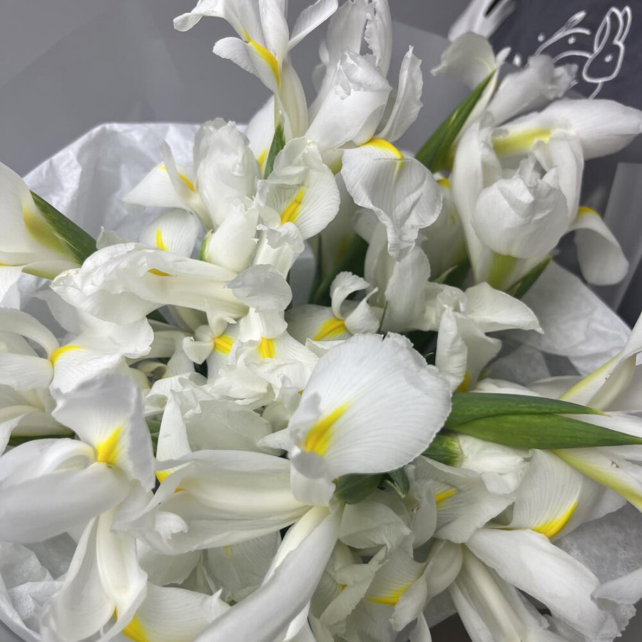 На фото букет 25 белых ирисов. В составе: ирис 25 шт, дизайнерская упаковка 1 шт, атласная лента 1 шт, . Все цветы свежие и ароматные, букет красиво оформлен и отлично подходит для подарка. Доступна доставка цветов или самовывоз.