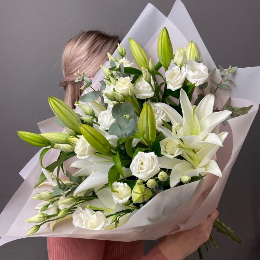 На фото букет «чистое сияние». В составе: лилия 3 шт, эустома (лизиантус) 4 шт, эвкалипт 3 шт, дизайнерская упаковка 1 шт, атласная лента 1 шт, . Все цветы свежие и ароматные, букет красиво оформлен и отлично подходит для подарка. Доступна доставка цветов или самовывоз.